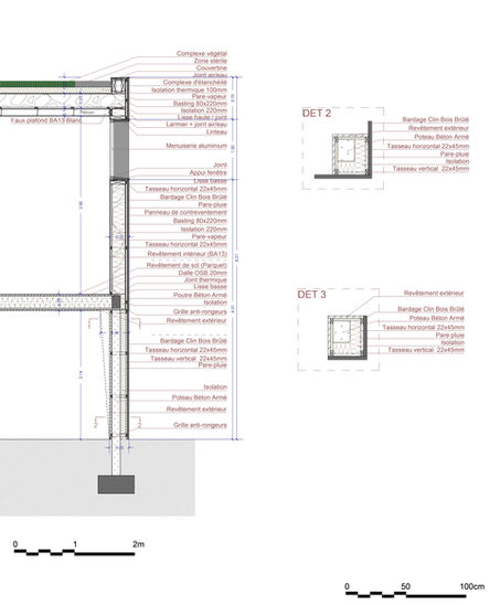 Le projet est une écoconception, visant une RT 2012 Neuf avec système de récupération d'eau de pluie en toiture, abattement des eaux pluviales par la toiture végétalisée et un système de ventilation double-flux pour l'extension.
